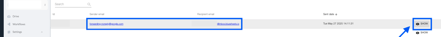 2. The page will show you the emails received by the forwarding email then you just click 'SHOW'. In the email body, you should be able to see the confirmation link from Gmail then you're good to go!